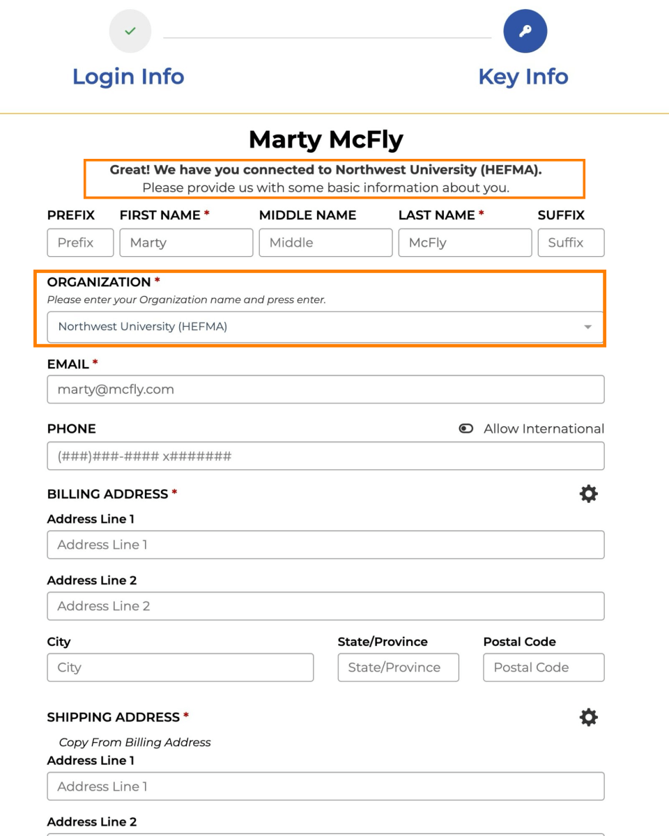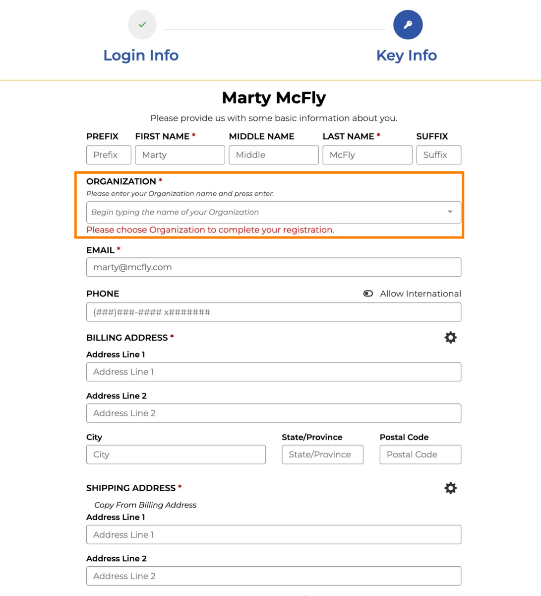 On the Key Info screen, complete your profile details. The most important field on this screen is Organization.