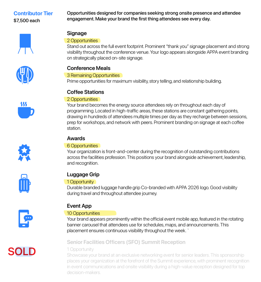 APPA offers tiered opportunities designed to meet a range of visibility goals. Benefits include recognition in event communications, brand visibility throughout the venue, and opportunities for direct engagement with attendees