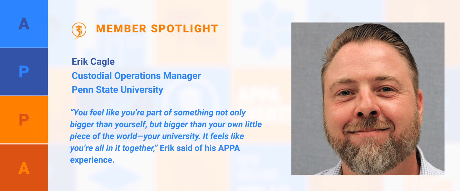 It was through these peer discussions that Erik learned of APPA, and this introduction came at an opportune time. He was deeply involved in developing a custodial professional development program when he attended his first Institute for Facilities Management.